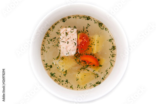 Russian fish soup in a white plate, isolated