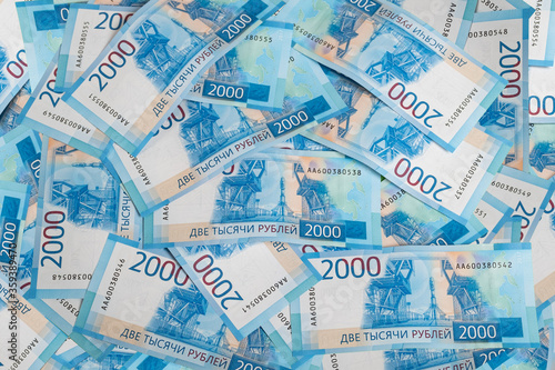 Russian money banknotes background texture. Russian ruble money, bills.