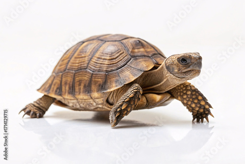 Russian tortoise walks across white surface, showcasing detailed hexagonal shell patterns and scaly limbs in warm natural lighting conditions.