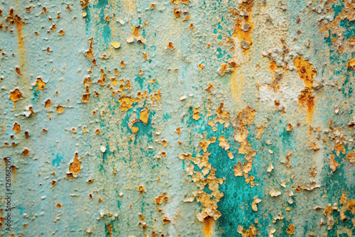 Rusted teal metal texture, peeling paint, outdoor, grunge background, design