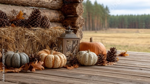 autumn, fall, pumpkin, pine cone, lantern, rustic, porch, wooden, field, forest, harvest, decoration, nature, outdoors, seasonal, hay, foliage, countryside, rural, landscape, serene, peaceful, cosy, warm, natural, scenic, decor, log, cabin, calmness, retreat, leaf, view, colours, bale, timberland, idylli, charme