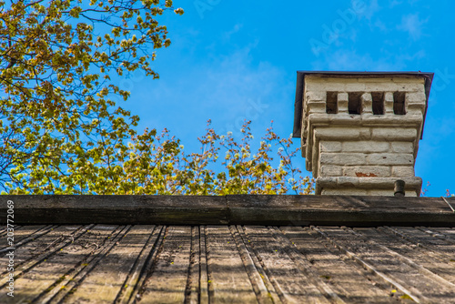 roof, house, old, chimney, wooden, brick, building, architecture, wood, pipe, summer, sky, home, tile, village, vintage, window, blue, colours, texture, stone, rural, background, beautiful, wall, travel, landscape, tree, fragment, new, structure, europa, country, cover, historic, estate, rustic, facades, bungalow