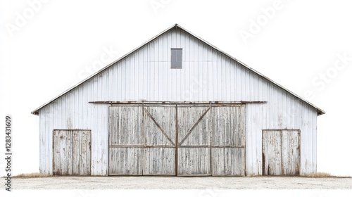 Rustic Barn: a weathered, white-painted barn stands tall, its wooden doors and simple architecture capturing a sense of rural charm and timelessness.