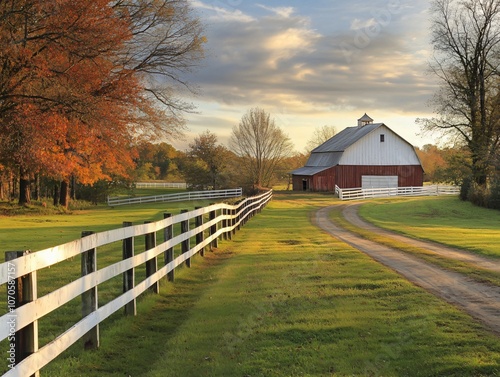 farm, barn, fence, white, country, road, rural, landscape, nature, grass, field, tree, fall, autumn, red, wood, building, farmhouse, farmland, agriculture, sunset, golden hour, sky, cloud, pasture, meadow, pathway, driveway, rustic, charming, peaceful, scenic, countryside, photo, image, stock, adobe