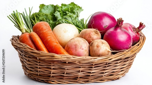 Rustic Basket Filled with Root Vegetables on Clean White Surface Still Life