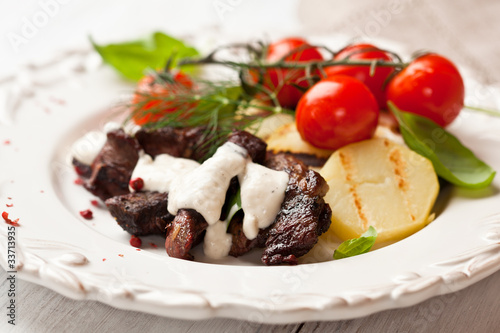dinner, beef, meal, cherry tomato, food, meat, basil, plate, herb, rustic, closeup, grilled, roasted, potato, closeup, vegetable, peppercorn