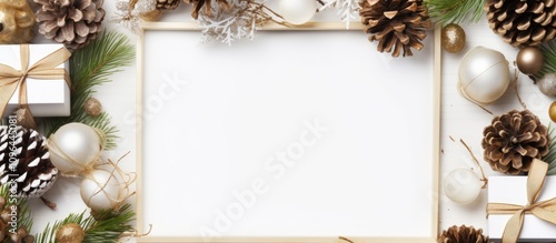 Rustic branch frame decorated with cones and gift boxes on a white wooden background ideal for holiday or seasonal greeting cards
