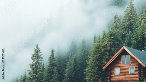 Rustic Cabin in Misty Forest: A cozy wooden cabin nestles among towering evergreen trees shrouded in a mysterious mist, creating a scene of secluded tranquility and natural beauty.