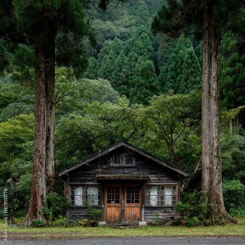 cabin, rustic, forest, tree, green, nature, wooden, house, landscape, exterior, calm, peaceful, tranquil, wood, mountain, damp, foggy, rainy, shaded, hidden, isolated, secret, small, simple, cosy, vintage, aged, dark, brown, grey, wood, door, window, path, grass, ground, beauty, scenery, rural, japanese, asian, calmness, calmness, peace, quiet