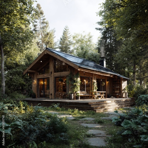 Rustic cabin nestled in a lush forest. Sunlight streams through trees, highlighting wooden structure and patio