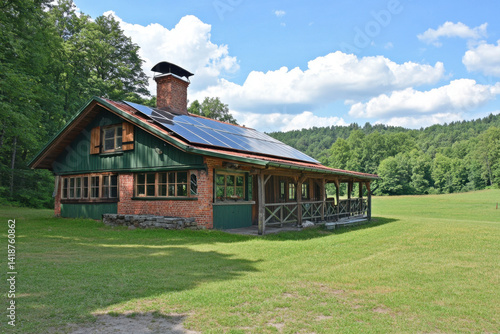 cabin, house, rustic, solar, panel, green, wood, nature, countryside, vacation, summer, architecture, eco, friendly, sustainable, energy, renewable, tour tourism, travel, filed, relaxation, peace, quiet, forest, hill, landscape, charming, cosy, simple, design, exterior, building, modern, holiday, retreat, idylli, peaceful, wooden, brick, porch, deck, view, grass, greenhouse