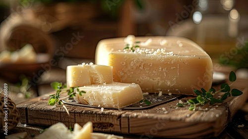 Rustic cheese blocks and slices on a wooden board, garnished with fresh herbs, creating a delicious and gourmet presentation.