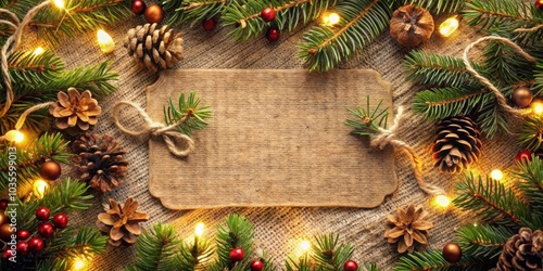 Rustic Christmas Background with Blank Paper Tag Surrounded by Evergreen Branches, Twinkling Lights, and Pine Cones