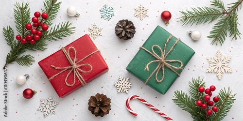 Rustic Christmas Flat Lay with Gifts, Pinecones, Ornaments & Berries V5