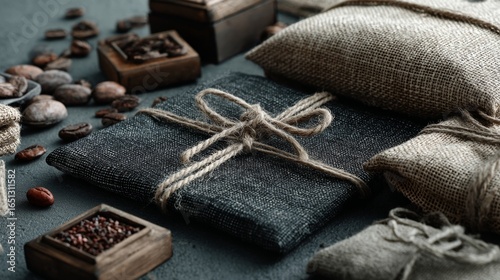 Rustic coffee setup with beans and burlap sacks on dark background for café photography product branding packaging lifestyle arrangement