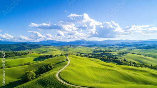 Rustic dirt road winding through rolling green hills, tranquil countryside landscape, charming and idyllic rural escape