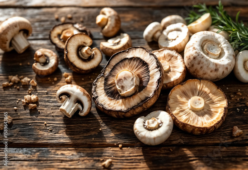 Rustic Display of Fresh Mushrooms on Wooden Surface in Warm Lighting
