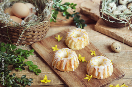 rustic, cake, muffin, cupcake, easter, spring, food, delicious, tasty, sweet, dessert, cake, wood, muffin, egg, egg, icing, sugar, blossom, snack, fresh, baked, closeup, epicure, pastry, decoration, green