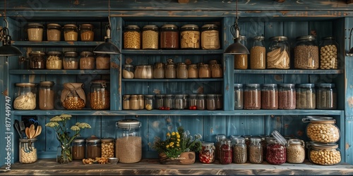 shelf, vintage, kitchen, pantry, old, cupboard, food, blue, wood, weathered, jar, traditional, wooden, european, interior, box, staple, clay, ambient, shop, lighting, bottle, nostalgic, glasses, retro, home, antique, house, cooking, supply, rustic, cookery, old-fashioned, homemade, rust-eaten, shabby, storage, farmhouse, ingredient, homelike, cosy, canned, preserving, jar, shelf, organic, hand-made, comfort