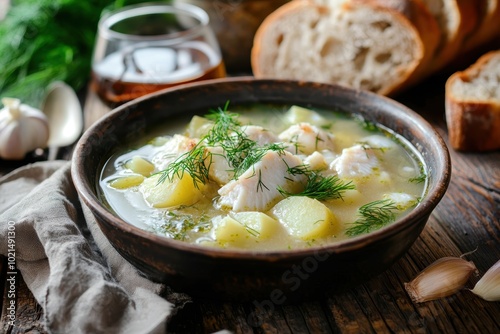 Rustic Fish Soup with Potatoes and Leeks Garnished with Fresh Dill on Wooden Table