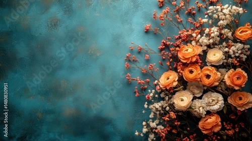 floral, arrangement, rustic, bouquet, flower, teal, background, orange, peach, cream, dried, branch, nature, decor, home, design, still, life, modern, vintage, autumn, fall, spring, summer, pretty, elegant, stylish, decorative, composition, display, art, photo, image, texture, surface, garden, gift, present, colourful, beautiful, detail, artistic, unique, creative, wallpaper