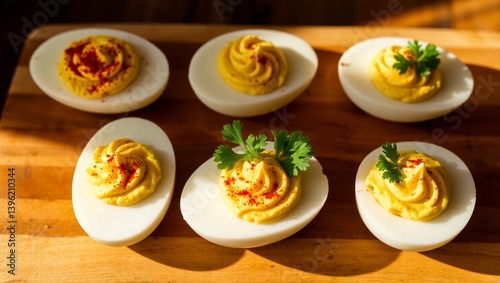 rustic food comfort food wooden board parsley garnish deviled eggs paprika topping classic deviled eggs close-up appetizer