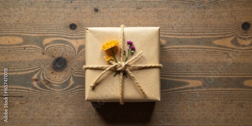 Rustic Gift Wrapped in Kraft Paper Adorned with Delicate Wildflowers on a Wooden Surface