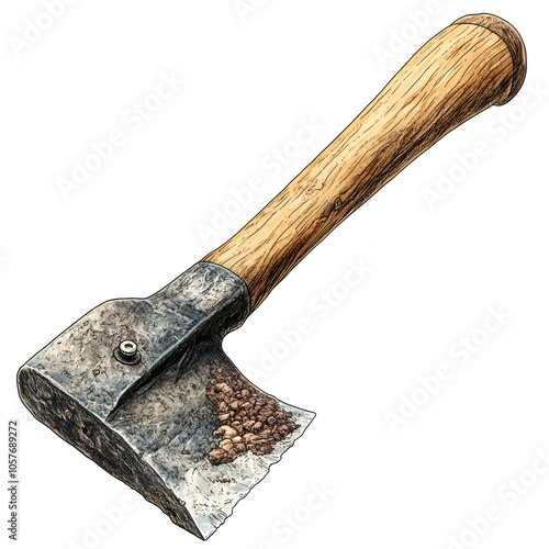 Rustic hand tool with a wooden handle and a metal blade for gardening, showcasing soil on the blade