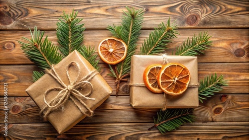 Rustic Holiday Gifts Wrapped in Kraft Paper with Dried Citrus and Evergreen Sprigs