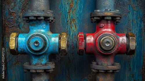 Rustic Industrial Pipes Red Blue Valves Metal Texture Vintage Aged Plumbing Equipm