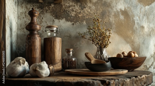 Rustic kitchen scene with wooden containers and dried herbs