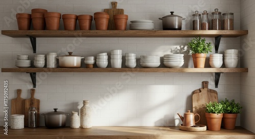 Rustic kitchen shelves, Terracotta pots, White ceramic dishes, Glass jars, Wooden cutting board, Potted herbs, Minimalist storage, Open shelving, Neutral color palette, Natural textures, Brick wall ba