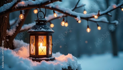 Rustic lantern, twinkling Christmas lights draped on snowy branch , bright, warm, ornament