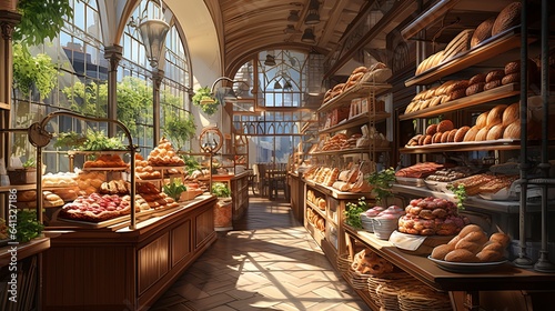 Rustic outdoor bakery and coffee shop with hot pastries and tables for patrons. Handmade bread Various loaves, baguettes. Rye, buckwheat, bran, gluten-free, wheat buns, sunny day