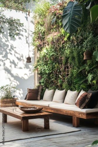 patio, garden, furniture, wooden, lounge, sofa, seating, plant, green, vertical, wall, decor, relaxation, cosy, comfortable, modern, rustic, minimalist, tropical, elegant, stylish, living, space, design, home, interior, exterior, relaxing, peaceful, sunlight, shadow, natural, organic, calm, beautiful, view, wood, texture, simple, luxury, nature, greenery, urban
