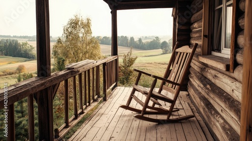 wooden, porch, rocking, chair, view, landscape, rural, countryside, autumn, tree, field, log, cabin, house, rustic, old, weathered, wood, deck, railing, outdoors, nature, serenity, peaceful, calm, tranquil, stillness, quiet, solitude, relaxation