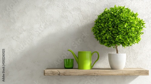 plant, watering, can, topiary, green, white, pot, shelf, rustic, wood, light, beige, wall, natural, shadow, decorative, home, decor, interior, design, still, life, minimalist, modern, simple, cosy, peaceful, calm, nature, garden, living, room, bedchamber, office, small, space, scandinavian, minimalism, style, texture, accent, item, arrangement, object, display, image, photo, background
