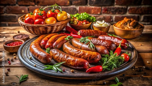 Rustic smoked sausage photography: gourmet, architectural food styling.