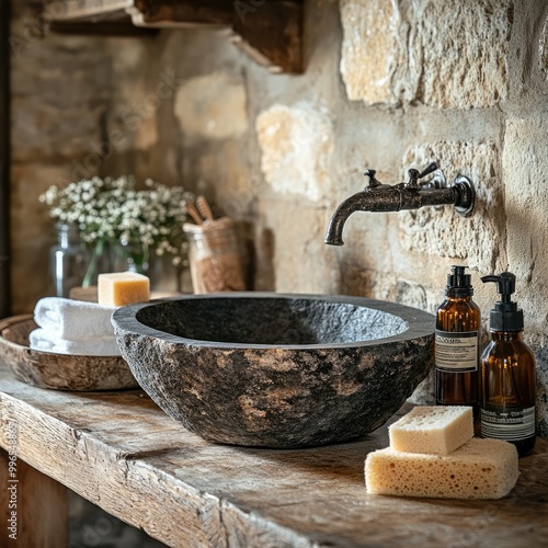 Rustic Stone Sink with Natural Sponges and Essential Oils for an Organic Bathroom Routine