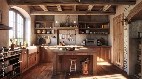 Rustic style kitchen with wooden furniture, shelves and cupboards, but with modern kitchen appliances and tools. Interior. Generative AI