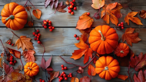Rustic styled composition of bright nostalgic pumkins, fallen leaves and berries