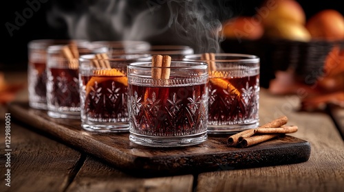 Rustic table spread with steaming mulled wine in vintage glasses, garnished with cinnamon sticks and orange slices, cozy fall backdrop with autumn leaves