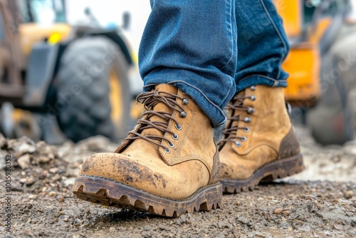 Rustic Tan Leather Work Boots on Muddy Ground at Construction Site