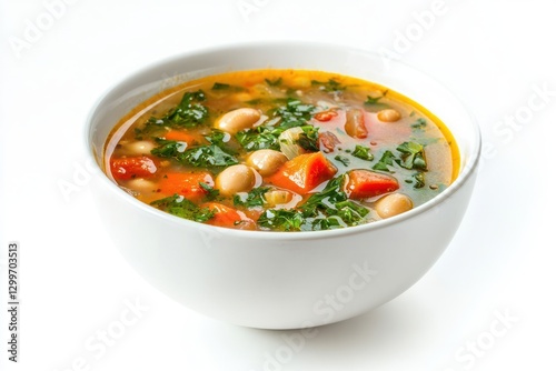 Rustic vegetable soup in white bowl with white beans carrots kale parsley on clean background