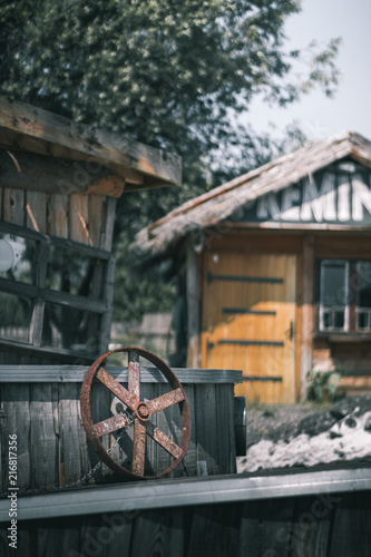 hovel, old, building, architecture, wood, water, mill, wooden, wheel, village, watermill, home, sky, rural, summer, vintage, tree, construction, nature, country, rustic, grass
