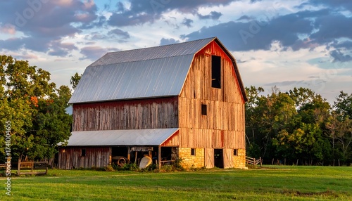 Rustic weathered wooden barn in the countryside stands bathed in warm sunlight with a backdrop of a cloudy, colorful sky