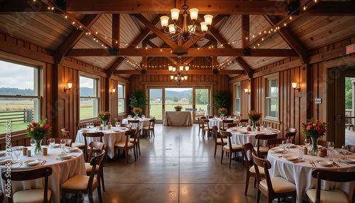 Rustic wedding venue decorated with lights, elegant celebration atmosphere