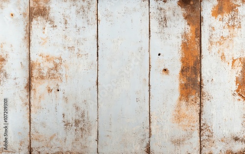Rustic white wooden texture with weathered paint and rust spots, suitable for backgrounds.