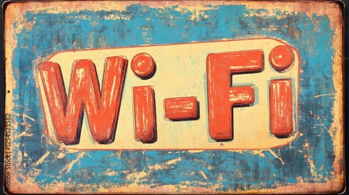 Rustic Wi-Fi sign, distressed metal, cafe background, internet access
