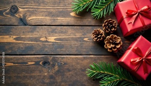 Rustic wood backdrop with wrapped presents, pine cones , rustic, gift wrapping, pine cones